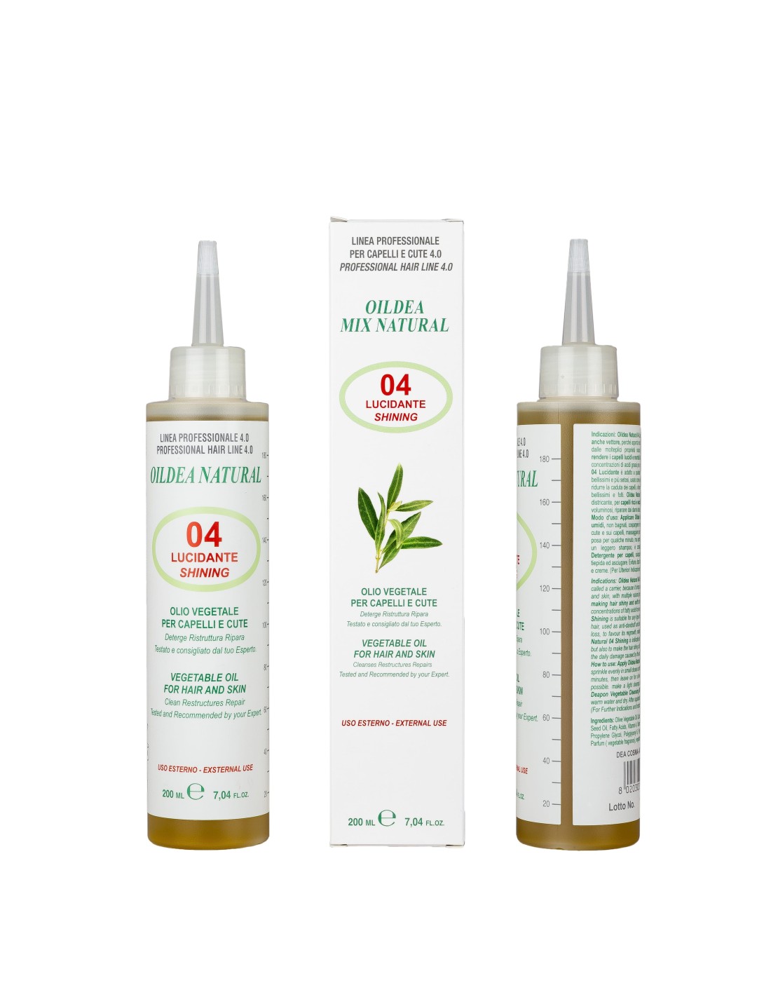 Oildea ® Mix Natural 04 Lucidante è un olio vegetale, detto anche vettore, perché apporta molti principi attivi ai capelli ed alla cute, come acidi grassi, Omega 3 – 6, Vitamine A - E, dalle molteplici proprietà naturali in esso contenute, particolarmente indicato per rendere i capelli lucidi e morbidi al tatto. Esso contiene le più elevate concentrazioni di acidi grassi per un potere emolliente, che ammorbidisce la chioma già dopo il primo trattamento. Ha proprietà antibatteriche, antivirali, antifungine, contribuisce ad avere capelli belli, luminosi, forti e spessi, previene le doppie punte, riduce i danni provocati da trattamenti chimici, come tinture, decolorazioni, mèches e permanenti, dal momento che penetra efficacemente nel fusto del capello, esaltandone il colore, come pure da asciugacapelli, da piastre e da arricciacapelli.. E’ un balsamo naturale, utilizzato per avere capelli lucidi, morbidi e voluminosi.