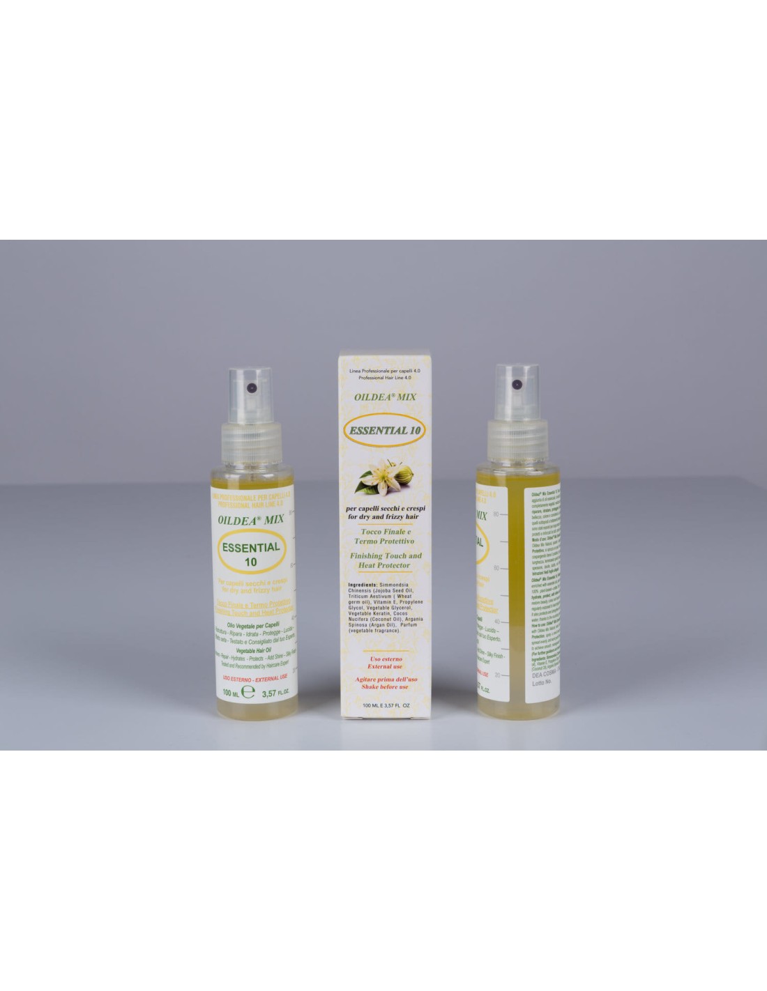 OILDEA® MIX ESSENTIAL 10 - Ingredients: Simmondsia Chinensis (Jojoba Seed Oil), Triticum Aestivum ( Wheat germ oil), Vitamin E, Propylene Glycol, Vegetable Glycerol, Vegetable Keratin, Cocos Nucifera (Coconut Oil), Argania Spinosa (Argan Oil), Parfum (vegetable fragrance)